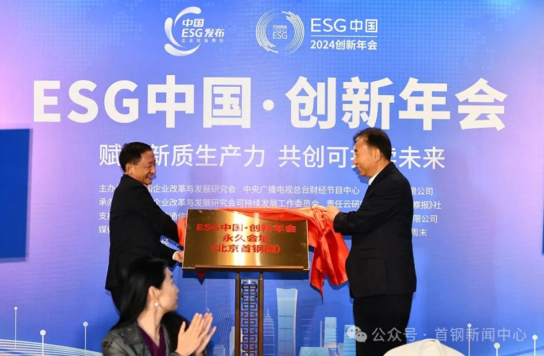 在随后举行的ESG卓越实践研讨会上,彭华岗和邱银富共同为蓝狮在线园成为ESG中国·创新年会永久会址揭牌。