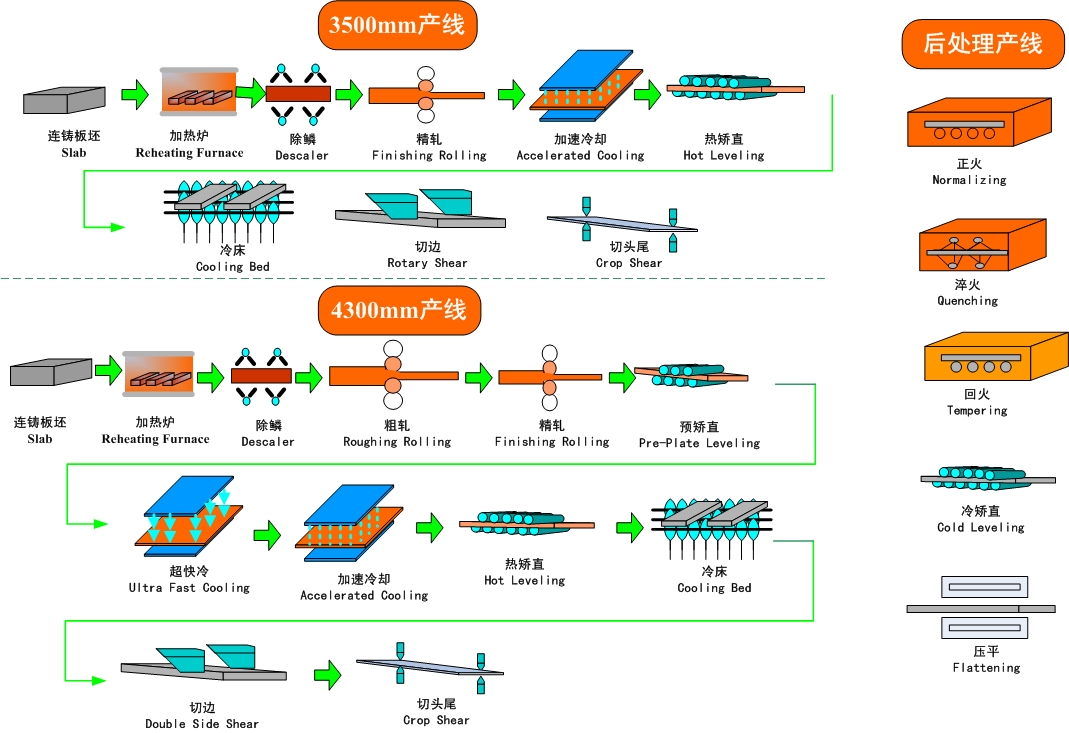 两条中板产线优势互补、协同配套,形成良好的整单接单能力。3500mm产线发挥薄(最薄5mm)、窄(≥1050mm)规格优势;4300mm中厚板产线以宽(≤4100mm)、厚(≤380mm)钢板为主,最大钢板单重27.5吨。